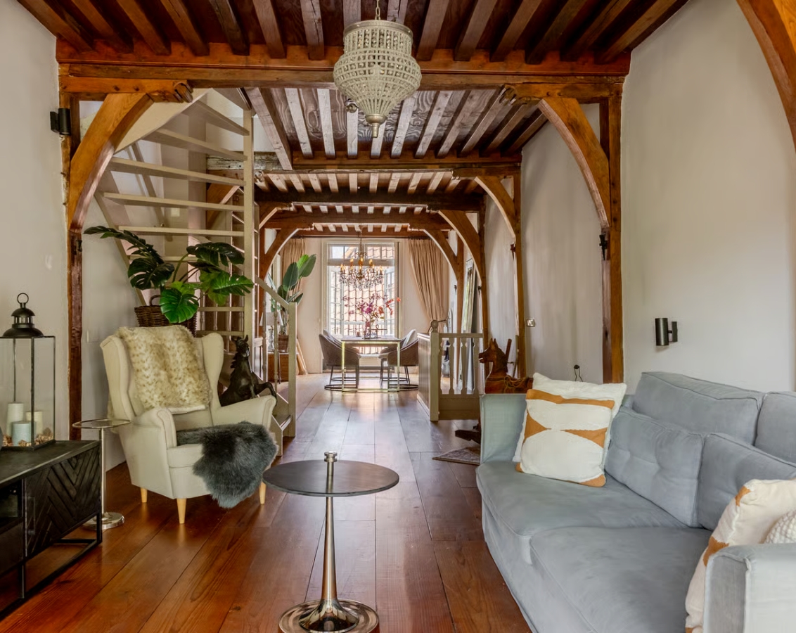 De sfeervolle ramen aan beide zijden geven een fijne beleving aan de riante living. Een authentieke Amerikaans grenen vloer en het historische plafond voegen de perfecte finishing touch toe aan deze unieke plek.