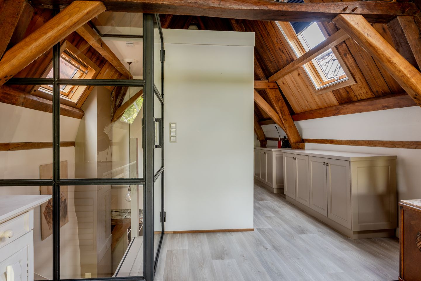 Via de stoere zwarte stalen pui bereikt u de indrukwekkende master bedroom aan de voorzijde van de woning, een echte eyecatcher! De originele kapconstructie met brede houten balken, meerdere dakramen en een nokhoogte van maar liefst ca. 4,45 meter geven de kamer een loft-achtige uitstraling. De sfeervolle koekoek (dakkapel) versterkt het ruimtelijke gevoel en zorgt voor extra lichtinval. Dankzij de riante afmetingen biedt deze kamer volop mogelijkheden – zo kan hier desgewenst eenvoudig een derde slaapkamer worden gecreëerd.